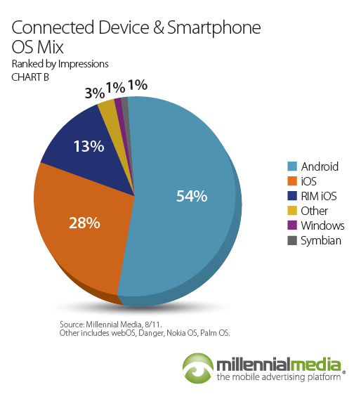 Deväť mesiacov po sebe sa Androidu podarilo porážať Apple. Toto tvrdí prieskum od Millennial Media s názvom „Mobile Mix“. Tieto tvrdenia sú postavené na používaní samotných zariadení a pripojenia do siete. Potvrdili, že Android si zaobstaráva čoraz viac a viac zákazníkov.