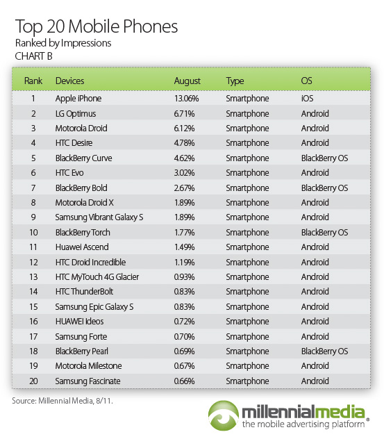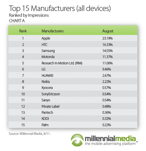 Apple sa posnažil a zostal ako výrobca č. 1 v prieskume najproduktívnejšieho výrobcu s 23.19%. HTC obsadilo 2. priečku s 16.33% so Samsungom v tesnom závese s 14.55%. Ďalej nasledovala Motorola s 11.37%, RIM s 11.06% a LG s 9.46%. Ďalšie dáta z tohoto prieskumu sú nižšie.