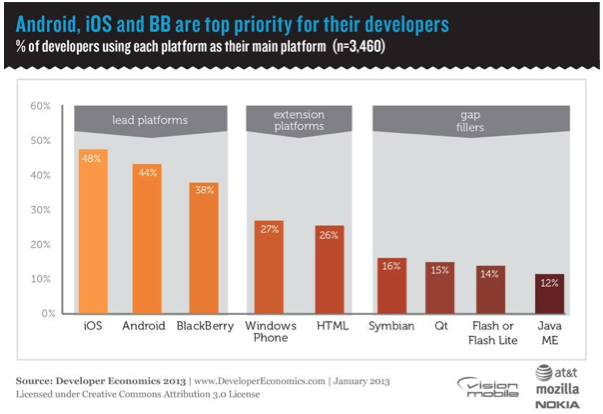 Analytická spoločnosť VisionMobile zverejnila výsledky z jej ďalšieho zaujímavého prieskumu, ktorý sa zameriava na analýzu vývojárskej ekonomiky. V tých sa píše, že operačný systém iOS od Apple, drží stále prvú priečku v prioritách vývojárov softvéru (obrázok nižšie). To znamená, že v prvom rade vývojár zhotoví aplikáciu pre iOS, takže ju užívatelia budú môcť skôr využívať, ako užívatelia mobilných zariadení s iným operačným systémom. Druhá priečka, menšia len o 2 percentá od prvej, patrí Androidu a tretia, s prekvapením, BlackBerry OS, o ktorú bude čoskoro pravdepodobne bojovať s Windows Phone od Microsoftu.