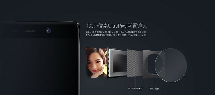 Na zadnej strane sa nachádza 13 MPix fotoaparát s optickou stabilizáciou a clonou f/2.0. Na prednej strane sa nachádza 4 MPix Ultrapixelový fotoaparát. Na prednej strane! Jedná sa o rovnakú jednotku, akú HTC použil v ich One M7.