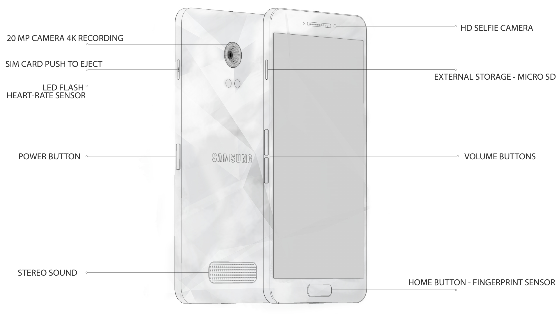 Čo sa špecifikácií týka, tam nás Samsung viac-menej nemá čím prekvapiť. To sa odzrkadlilo aj v koncepte, ktorý nám ukazuje 5,2-palcové Quad HD zariadenie so štvorjadrovým čipsetom Snapdragon 810, stereo reproduktormi a 20 Mpx fotoaparátom s optickou stabilizáciou obrazu. Čo však zaujímavé je, je celá kovová konštrukcia s kovovým rámikom po bokoch.