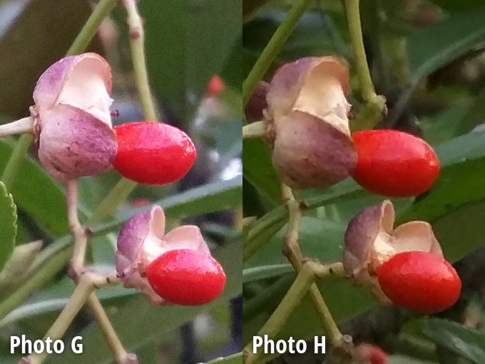 Tu je detail kríku s červenými bobuľami. Vysoký kontrast červenej ktorý majú občas smartfóny problém správne zachytiť. Tak, ktoré zariadenie odviedlo lepšiu prácu?
