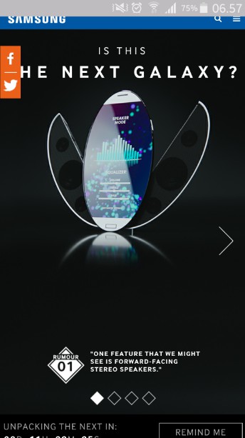 Na prvom obrázku sa objavil text „Jedna funkcia, ktorú možno uvidíme, sú predné stereo reproduktory.“ Na druhom obrázku „Nový Galaxy by mal byť odolný.“ Na poslednom obrázku „Displej na Samsung Galaxy sa má dostať na tri strany.“ Takýto prístup je vcelku nezvyčajný. Len sa tak zamyslite, kedy ste naposledy videli výrobcov promovať špekulácie o svojom novom smartfóne? Vôbec by nás teda neprekvapilo, ak by Galaxy S6 skutočne prišiel s prednými stereo reproduktormi, odolnou konštrukciou a displejom zakriveným po oboch stranách.