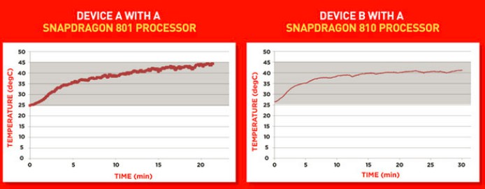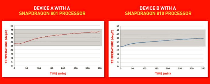 Snapdragon 801, ktorý bol využívaný hlavne vo vlajkových lodiach z minulého roka, ako napríklad One M8 či Galaxy S5 sa na 45 stupňov Celzia zahrial už po dvadsiatich minútach hrania hry Asphalt 8. Snapdragon 810 bol po dvadsiatich minútach o 5 stupňov chladnejší.