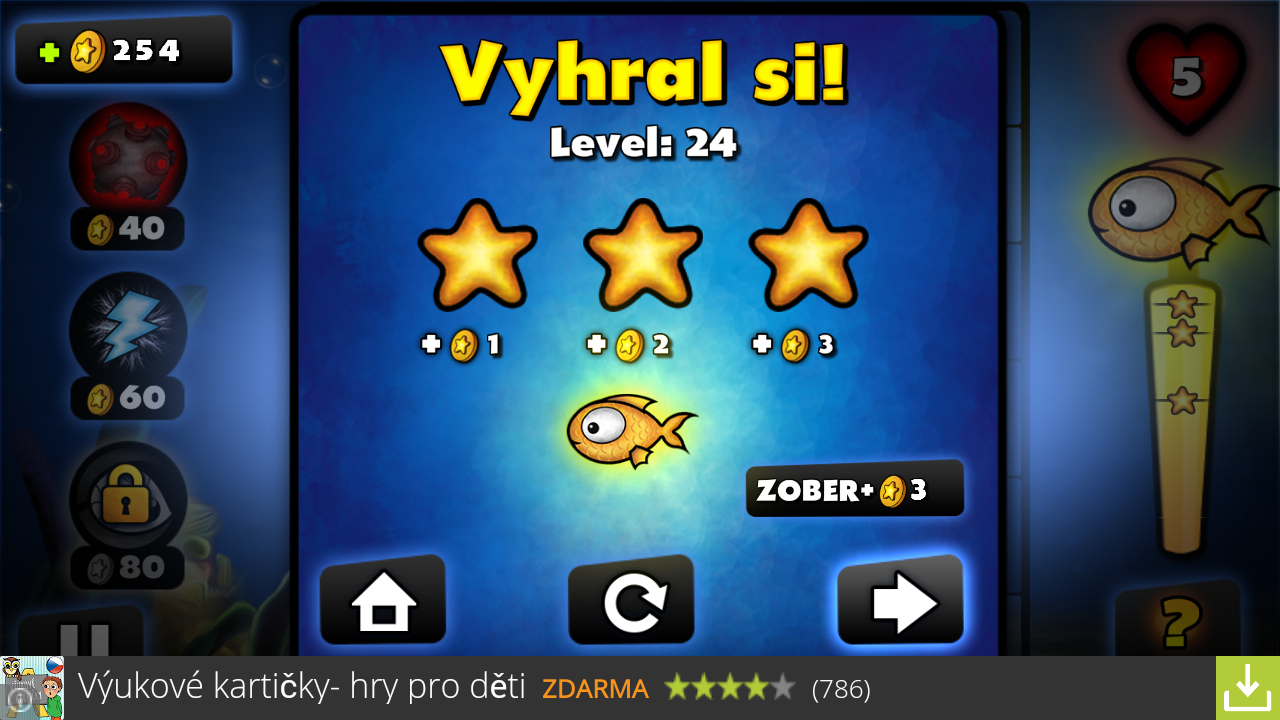 Autori nezabudli ani na hviezdičkové hodnotenie a za každý level, ktorý ukončíte obrovskou reťazovou reakciou získate ešte zlatú rybku, ktorá slúži k meraniu síl s vašimi online kamarátmi.