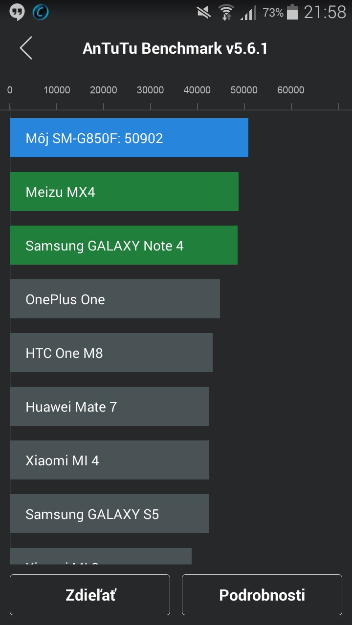 Neviem, či stojí za to, písať niečo navyše. Pravdepodobne najlepším dôkazom, že Alpha s výkonom naozaj problémy nemá, je skóre v AnTuTu. 50902. Telefón je na prvom mieste, predbehol dokonca aj minuloročného víťaza Meizu MX4, aj Galaxy Note 4, ktorá používa Snapdragon 805. Zaujímavé.