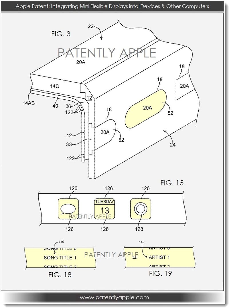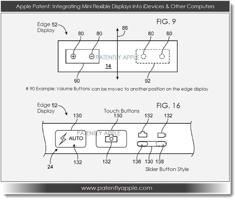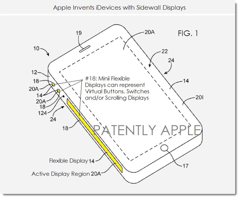 Zaujímavý je aj nový patent, ktorý spoločnosti pridelil americký patentový úrad USPTO. Apple si ešte v roku 2013 požiadal o pridelenie patentu, na ktorom je zariadenie s ohybnými bočnými stranami s virtuálnymi tlačidlami, meniacimi sa podľa potreby, resp. aplikácií.