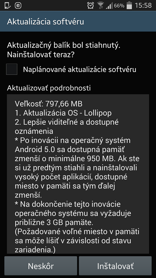 Aktualizácia o veľkosti 797,66 MB na prvé zariadenia dorazila cez OTA (Over The Air) a tak je dobré ju sťahovať len vtedy, ak budete pripojení na Wi-Fi. Mediz zmenami môžete očakávať nový Android 5.0 Lollipop s runtime ART a viac.