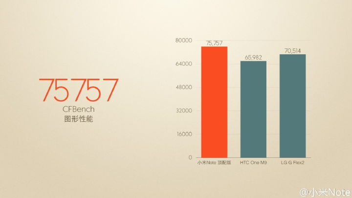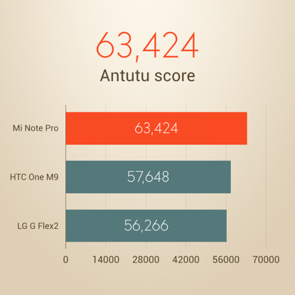 8-jadrový Snapdragon 810 (v2.1) v Xiaomi Mi Note Pro tak vďaka vyššiemu výkonu dokázal nadobudnúť v benchmarkovej aplikácii AnTuTu chvályhodných 63,424 bodov, čo je pri porovnaní s inými Android smartfómi ako HTC One M9 či LG G Flex 2 veľmi slušné. Tie taktiež ponúkajú rovnaký čipset, avšak v staršej verzii. Veľký rozdiel je ale aj v zobrazovacích jednotkách – One aj Flex majú vo výbave iba Full HD displej a Note Pro pre zmenu až QHD.