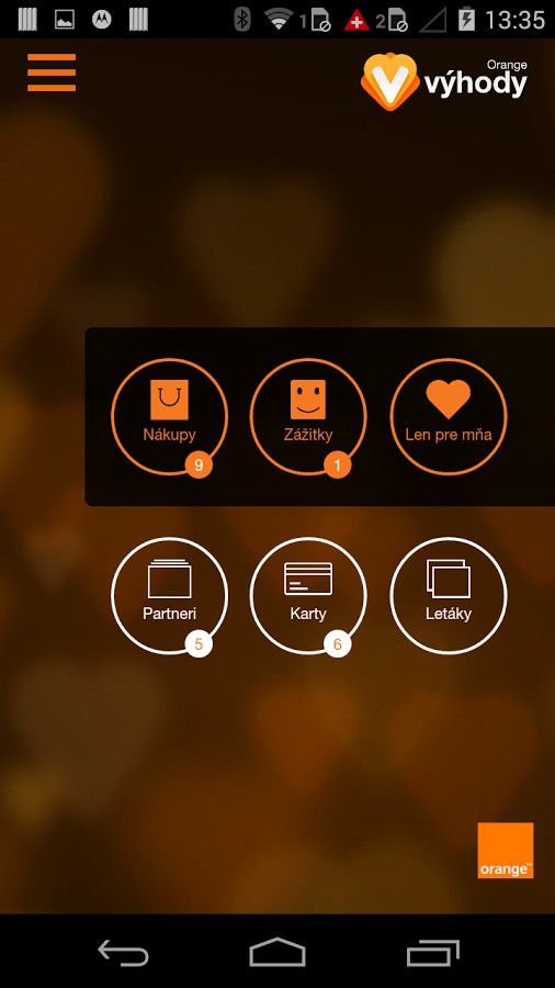 Aplikácia je rozdelená na šesť základných položiek, ako napríklad nákupy, zážitky, len pre mňa, partneri, atď. Tieto ponuky a atraktívne zľavy budú špecificky cielené pre vás. Na základe profilu a lokality zákazníka vám tak Orange prinesie relevantné a exkluzívne ponuky.