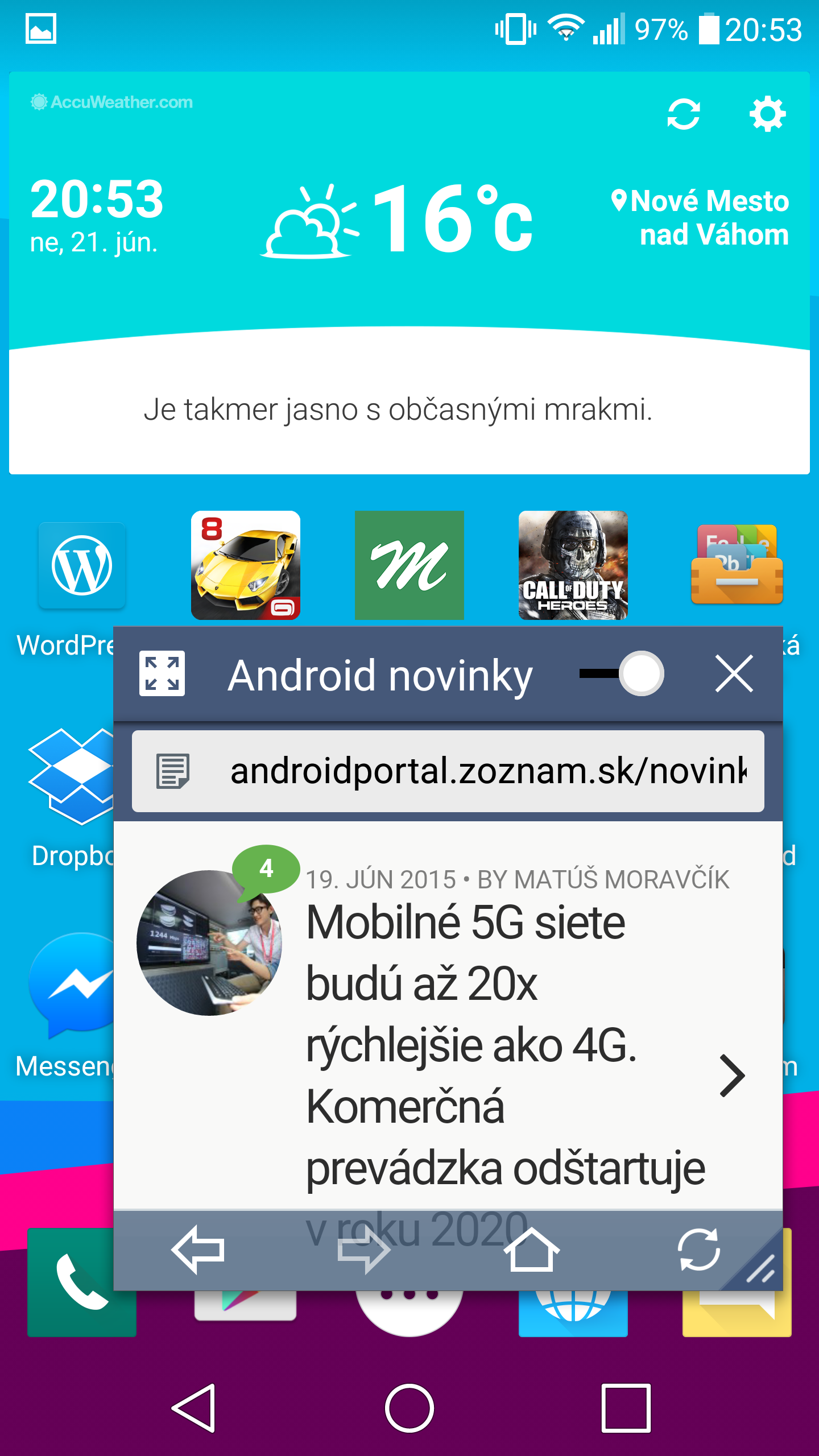 Taktiež prehnutý Quantum IPS displej prešiel oproti displeju minuloročnej generácie G3 drobným vylepšením. Nie však v oblasti rozlíšenia, ale kontrastu, presnosti farieb či takého jasu. Výsledok je vidieť najmä pri letných dňoch s priamym slnkom, kedy býva problém s čitateľnosťou, no ten v prípade LG G4 určite nehrozí. Čerešničkou na vrchole možno označiť hustotu pixelov, ktorá dosahuje hodnotu až 538 ppi. Neprekážalo mi dokonca – asi prvýkrát – ani automatické nastavenie jasu. Smartfón v tmavom prostrední stíšil svietivosť displeja na takú úroveň, že to vyhovovalo aj mojim citlivým očiam.