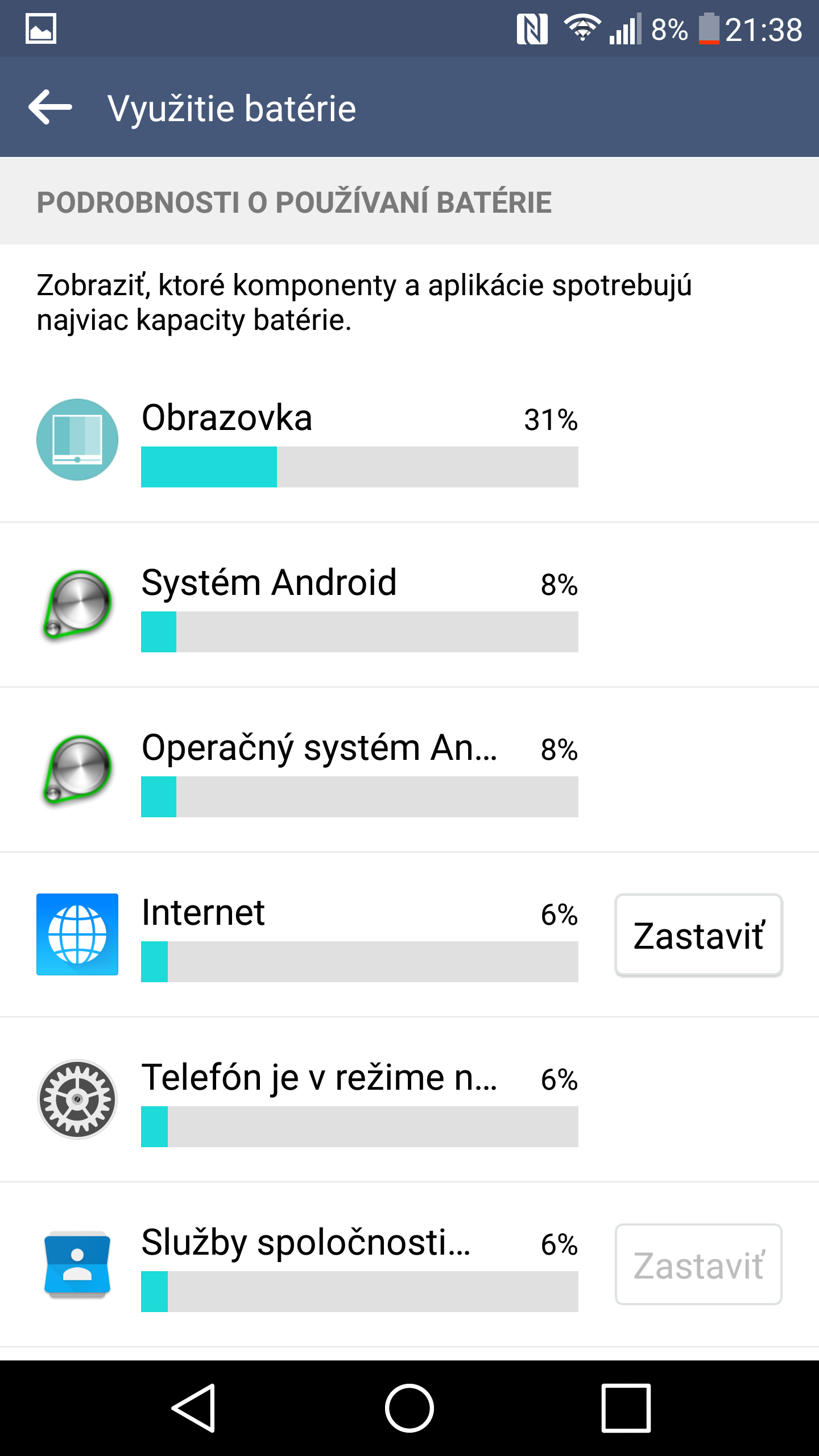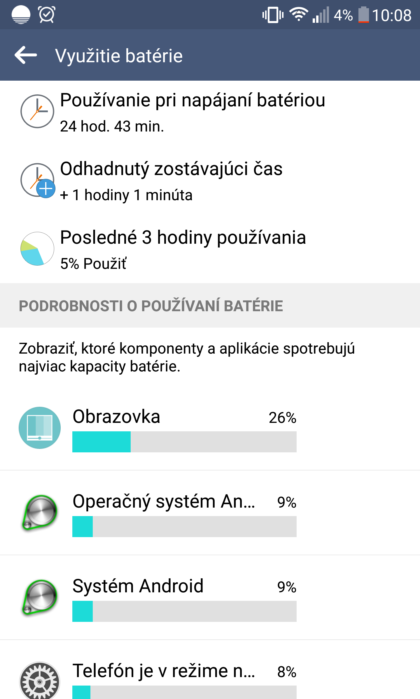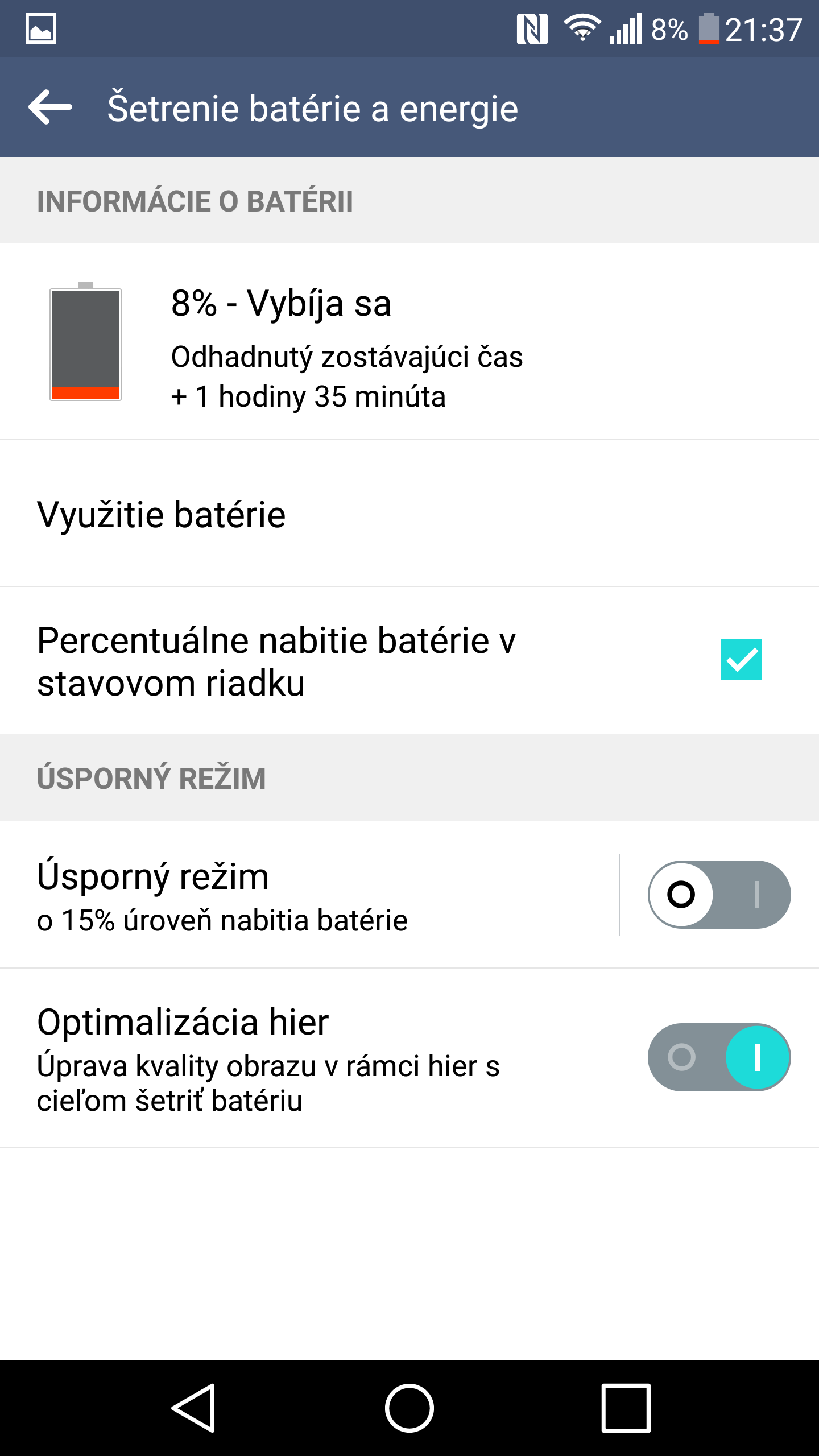 Aj napriek tomu, že výrobca použil 3000 mAh batériu, smartfón vydržal po jednom nabití a mierne väčšej záťaži niečo okolo 8 až 9 hodín. Pokiaľ si však odpustíte nejaký ten film alebo hru, bez akýchkoľvek problémov to dotiahnete na takých 12 až 14 hodín. Pri naozaj skromnom používaní som vyťahoval G4 z nabíjačky okolo pol desiatej ráno a naspäť som ho pripájal ďalší deň v zhruba rovnakom čase.