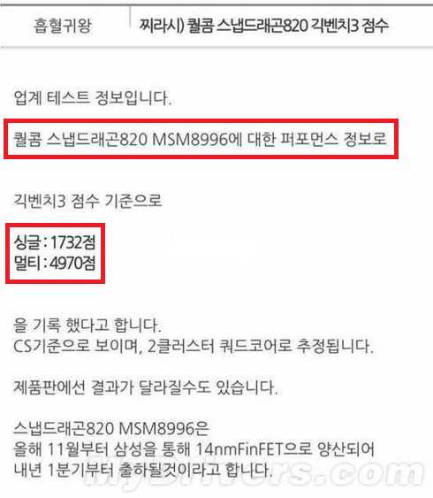 Pri výrobe novinky má dokonca asistovať juhokórejský Samsung, ktorý tak – podobne ako pri svojom čipsete z Galaxy S6 – použije moderný 14 nanometrový proces. To taktiež potvrdil zverejnený výsledok, kde dosiahol Snapdragon 820 v rámci testu jedného jadra 1732 a pri teste viacerých jadier 4970 bodov, pričom predchodca získal 1227 a 4424 bodov.