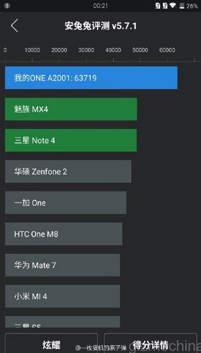 Nové výsledky z ďalšieho testu aplikácie AnTuTu však odhalili, že OnePlus 2 prešiel menšími zmenami a vyladením softvéru, ako aj hardvéru. V benchmarku totiž s rovnakým čipsetom s označením A2001 dosiahol 63 719 bodov. Zariadenia, ktoré taktiež poháňa Snapdragon 810 dosiahli menšie skóre; Xiaomi Mi Note Pro (63 424), HTC One M9 (57 648) a LG G Flex 2 (56 266).
