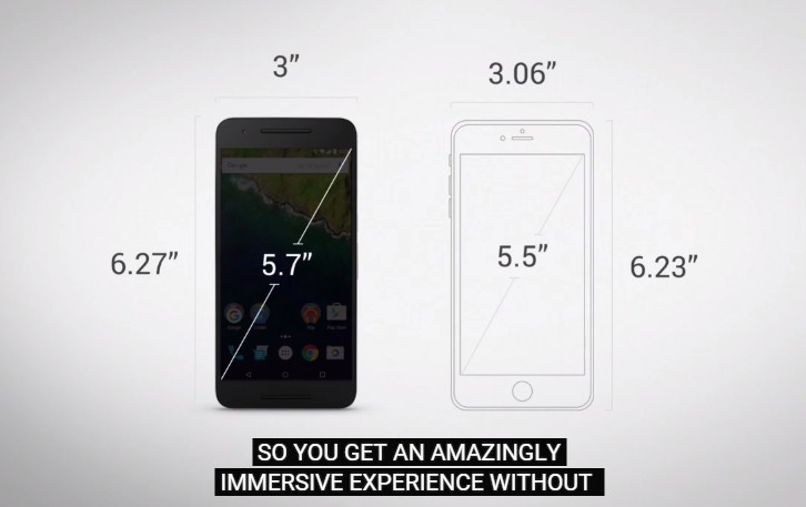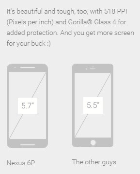 Podľa Google má prednú stranu Nexus 6P až zo 74 percent pokrývať jeho 5,7-palcový Quad HD displej, vďaka čomu je Nexus 6P približne rovnako veľký ako iPhone 6s Plus, ktorý disponuje len 5,5-palcovou zobrazovacou jednotkou.