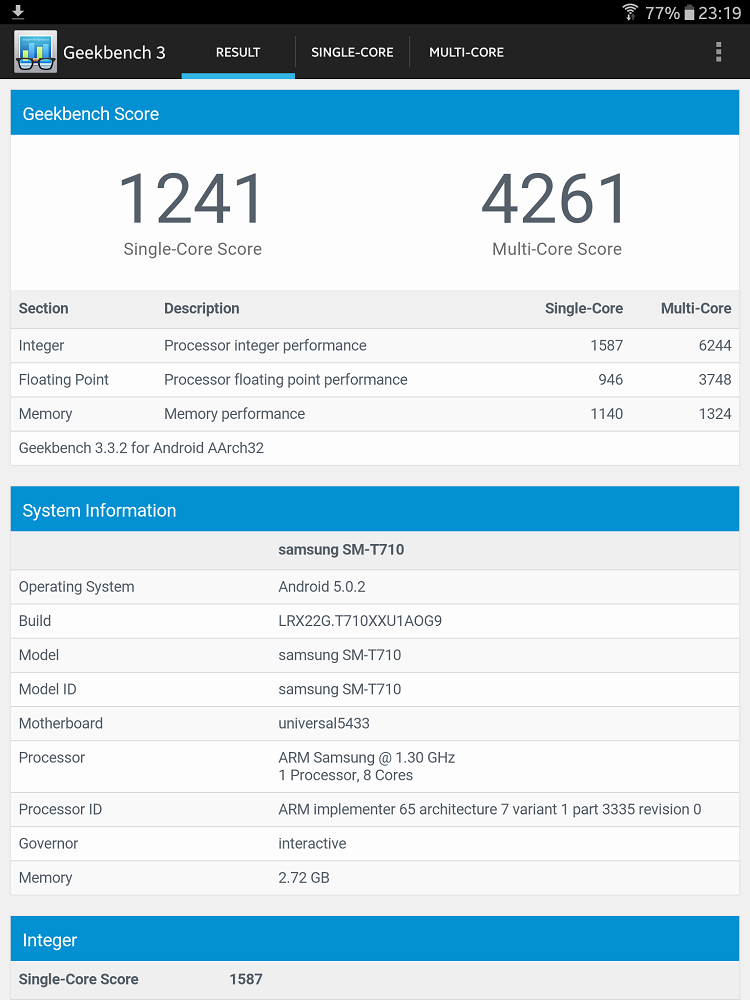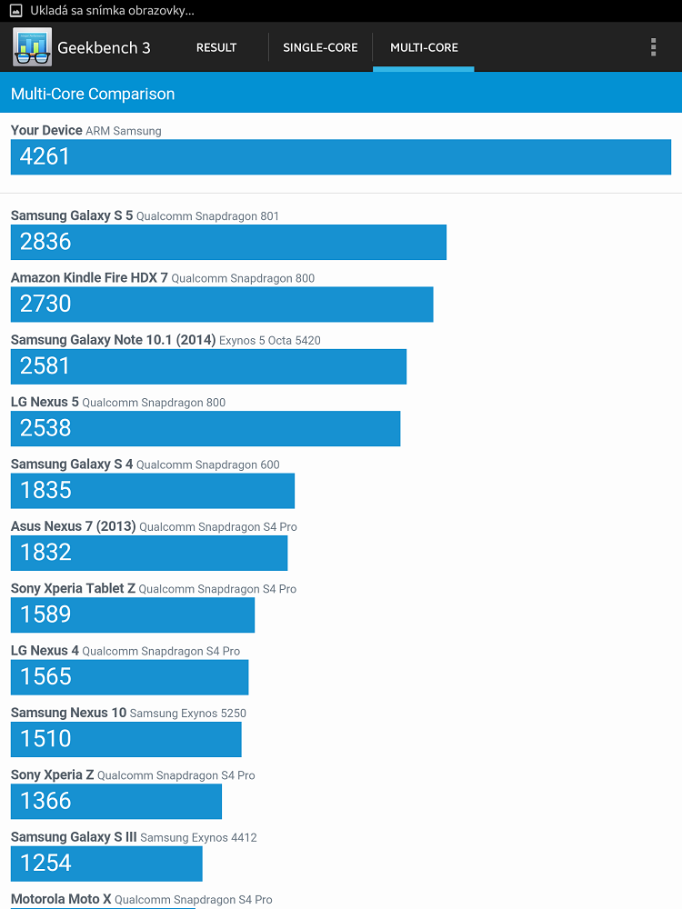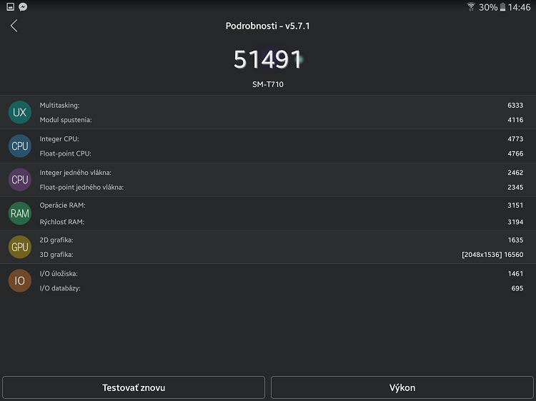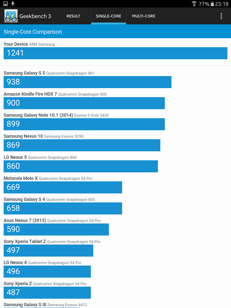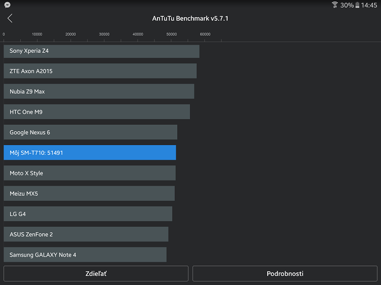 O nadštandardnom výkone Galaxy Tab S2 hovorí aj dosiahnutý výsledok v porovnávacej aplikácii AnTuTu, kde sa mu podarilo získať až viac ako 51-tisíc bodov, čím sa zaradil medzi minuloročný Nexus 6 a tohtoročný hi-end model Meizu MX5 s Helio X10 od spoločnosti MediaTek.