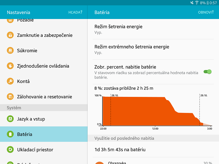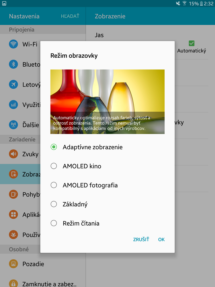 Tradícia v podobe nadmernej sýtosti farieb nestratila ani tentokrát dôvod na existenciu. Kontroverzný Super AMOLED panel s uhlopriečkou osem palcov teda opäť ponúka vysokú saturáciu, čo však môžeme pomerne jednoducho vyriešiť – ak to samozrejme považujeme za problém – prostredníctvom nastavení zobrazenia, kde iba prepneme na základný režim zobrazenia. Farby potom pripomínajú LCD alternatívu, takže padnú vhod aj tvrdším odporcom produktov s juhokórejskou značkou Samsung. Na výber je taktiež adaptívne AMOLED kino, AMOLED fotografia alebo čítací režim so schopnosťou šetriť naše oči a tým pádom redukovať ich únavu.