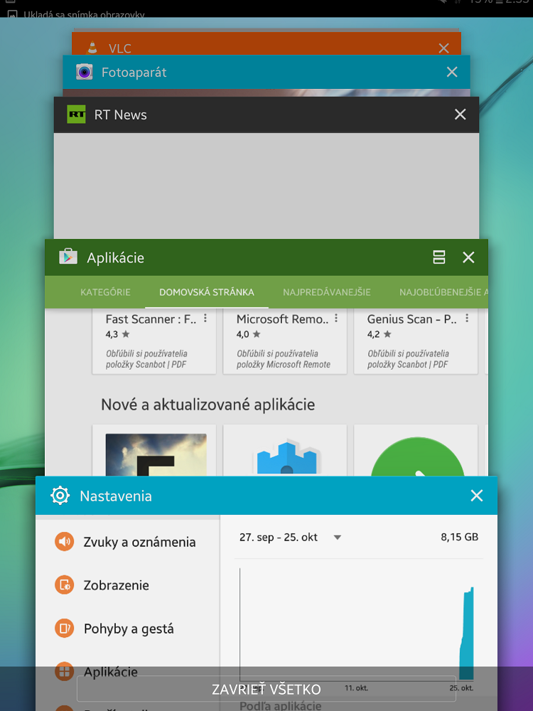 Galaxy Tab S2 po stlačení spúšte zaostroval za zlomok sekundy a dokázal natočiť aj Quad HD video. Fotenie panorámy navyše prebehlo bez akýchkoľvek upozornení o rýchlom pohybe rúk, čo nemožno povedať ani pri niektorých drahších smartfónoch. Medzi režimami rovnako nájdete i manuálny, HDR, takzvaný duálny fotoaparát a rad ďalších, ktoré si stiahnete z virtuálneho obchodu Samsung úplne zadarmo.