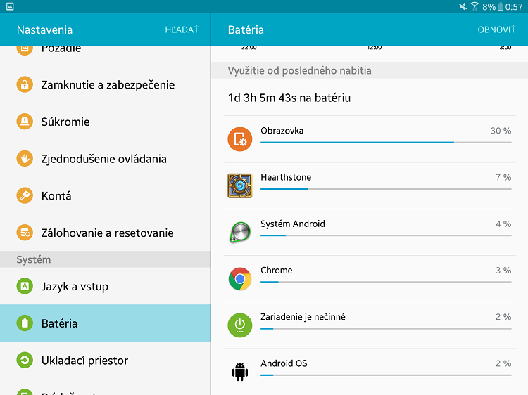 Kombinácia šetrného čipsetu Exynos a iba 4000 mAh batérie dokáže naozaj nepredvídateľné veci. Tablet nemal ani po značnom znížení kapacity problém vydržať zhruba okolo sedem hodín pri náročnejšom používaní, ktoré zahŕňalo pravidelné hranie graficky menej komplexnejších Android hier, pozeranie niekoľkých častí zhruba dvadsaťminútového seriálu a niekoľkohodinové surfovanie na webe. Bez hrania by ste sa vedeli vyšplhať asi o pol alebo až hodinu vyššie. Oproti minuloročnej generácii teda prináša výrazne – až niekoľkohodinové – zhoršenie výdrže. Ak ale zoberieme do úvahy, že ide o tablet a teda zariadenie, ktoré sa nevyužíva tak frekventovane ako smartfón, bežnému používateľovi zrejme po plnom nabití deň aj niečo vydrží. Ohľad taktiež musíme brať na prostredie, v ktorých tablety väčšinou používame. V takýchto podmienkach sú zväčša poruke elektrické zásuvky, takže si ho môžeme pri ležaní v posteli nechať bezproblémovo nabíjať. Výdrž preto teda nehrá medzi tabletmi až tak dôležitú rolu.