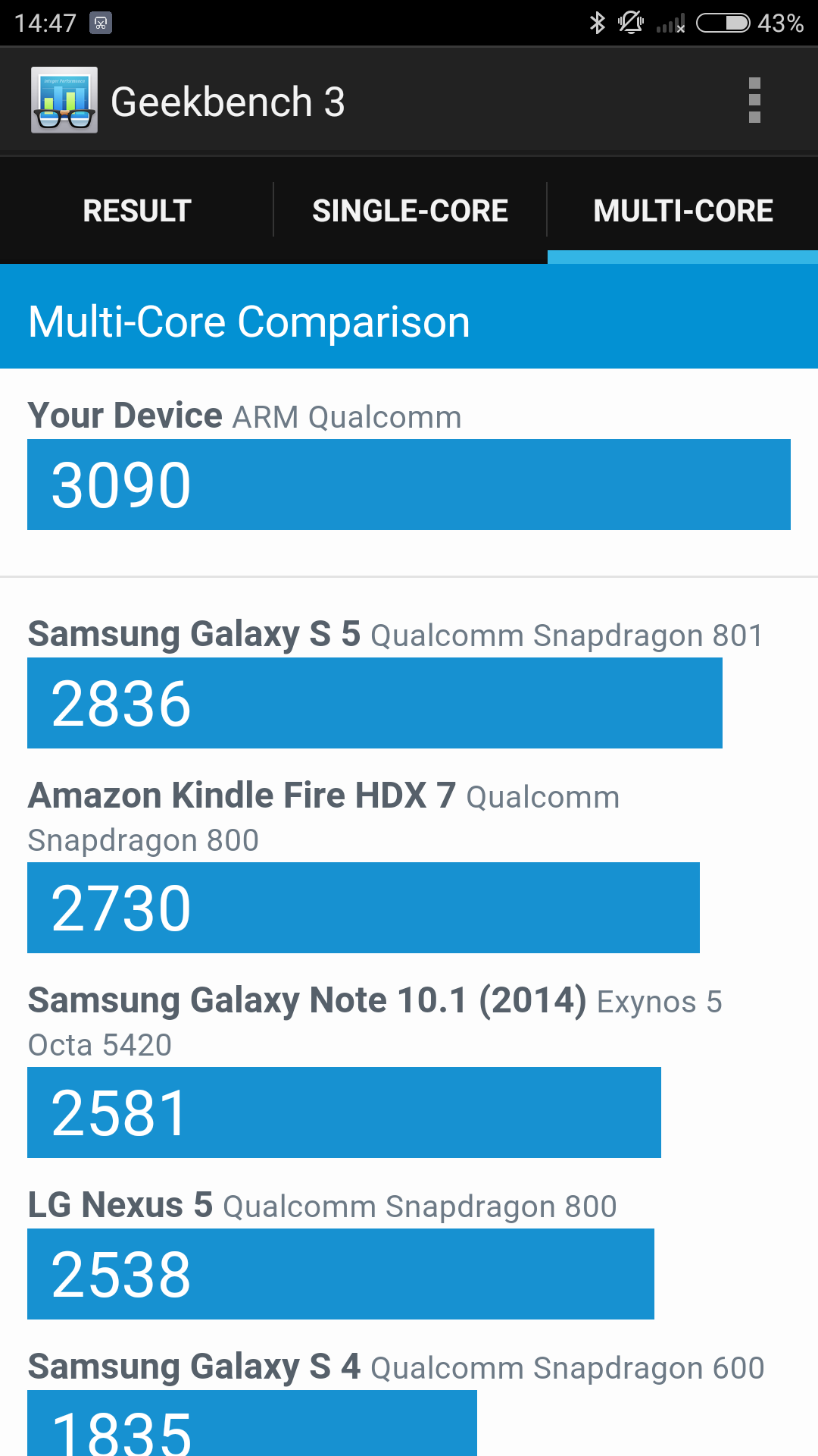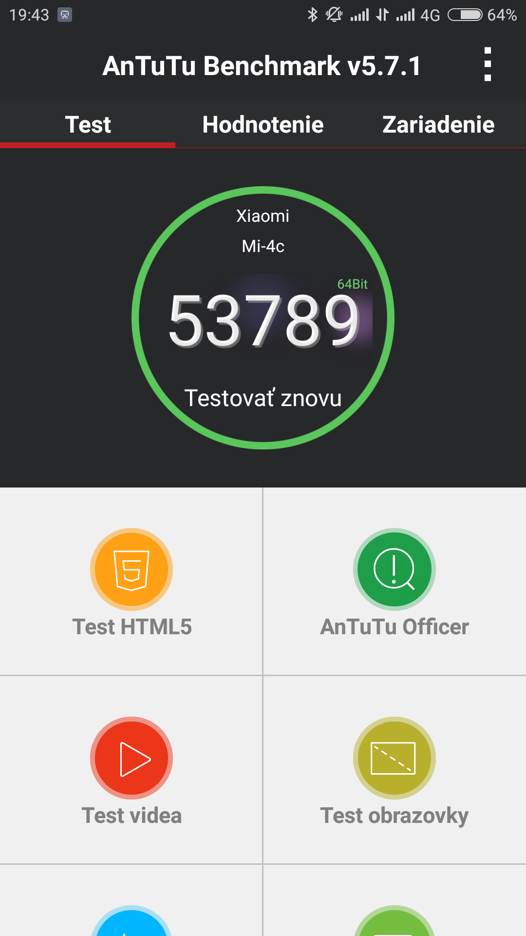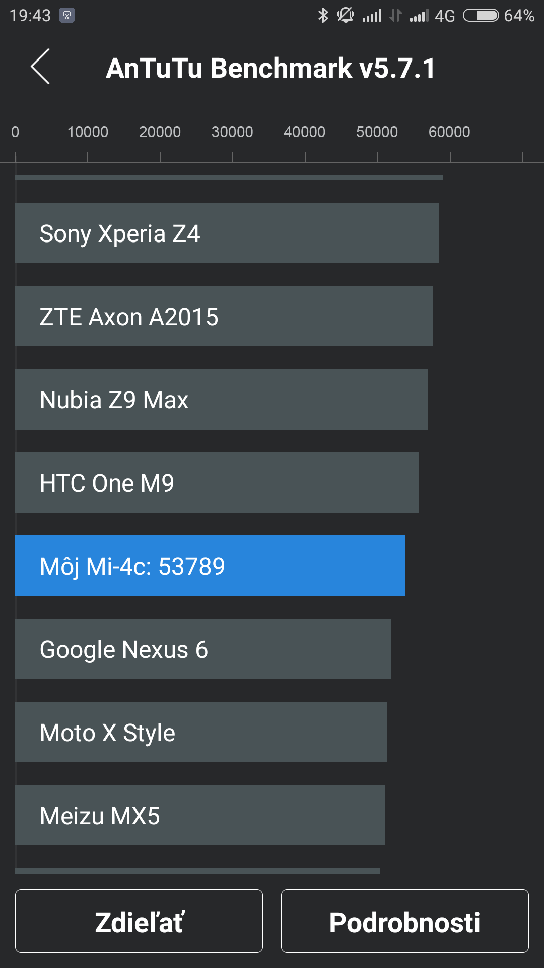 Výsledok z populárnej benchmark aplikácie AnTuTu ma však celkom prekvapil. S čipsetom Qualcomm Snapdragon 808 (šesťjadrový CPU, Adreno 418 GPU) dokázal Mi 4c poraziť aj tohtoročný high-end LG G4, ktorý ho má tiež. Dôležitú rolu tu teda podľa všetkého zahrala absencia náročného Quad HD rozlíšenia či prítomnosť vyladenejšej grafickej nadstavby MIUI.
