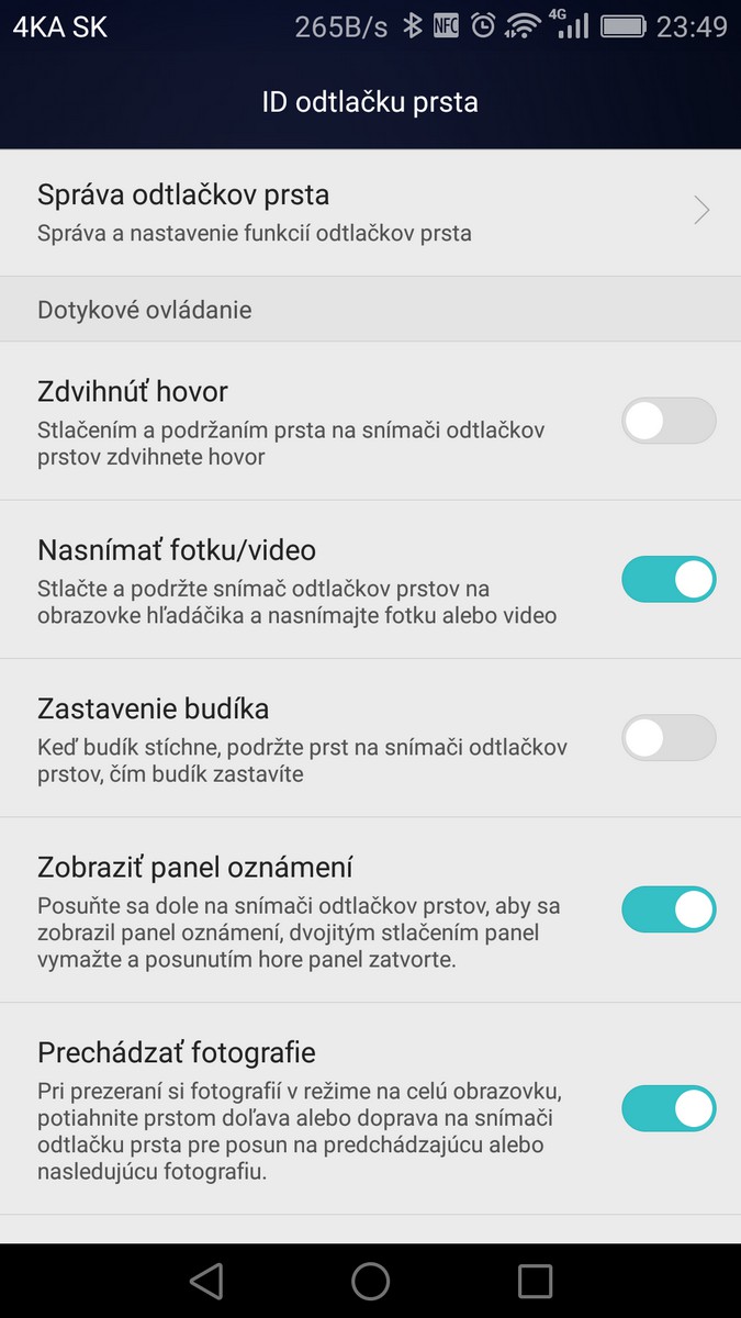 Implementácia snímača či už softvérová alebo hardvérová je jednoducho vynikajúca. Snímač na Mate S som si nevedel a doteraz neviem vynachváliť a veľmi ma mrzí, že s niečím tak kvalitne spracovaným neprišlo viac výrobcov. Prečo to všetko píšem? Páčilo sa mi napríklad to, že po priložení prstu na snímač sa telefón automaticky prebudí a hneď aj odomkne. Nemusíte teda zbytočne stláčať tlačidlo na vypnutie a zapnutie zariadenia. Snímač odtlačkov však slúži aj na ďalšie veci. V nastaveniach nájdete možnosti ako napríklad schopnosť zdvihnúť hovor, odfotiť fotku, vypnúť budík či dokonca stiahnuť lištu upozornení. Pýtate sa ako je to možné? Snímač je totiž vybavený aj dotykovou vrstvou, ktorá dokáže rozoznať či swipujete hore, dole alebo do strán.