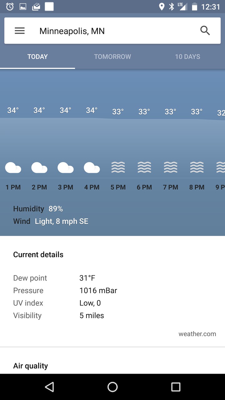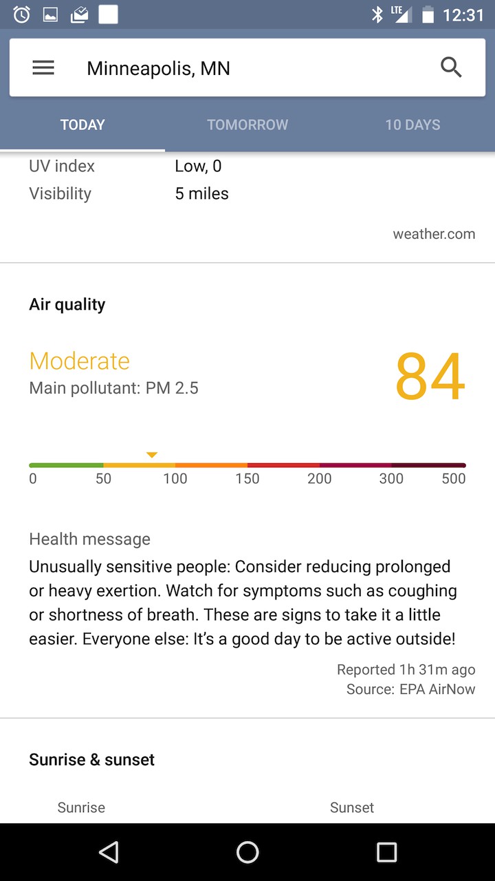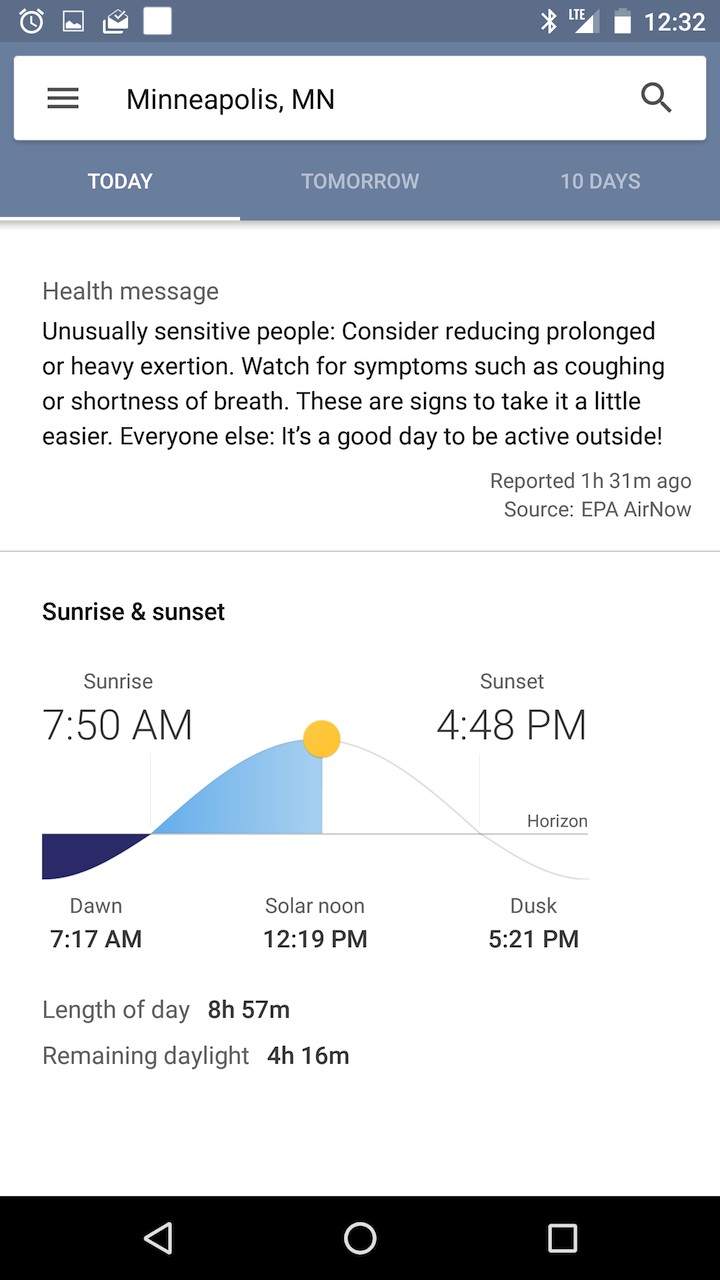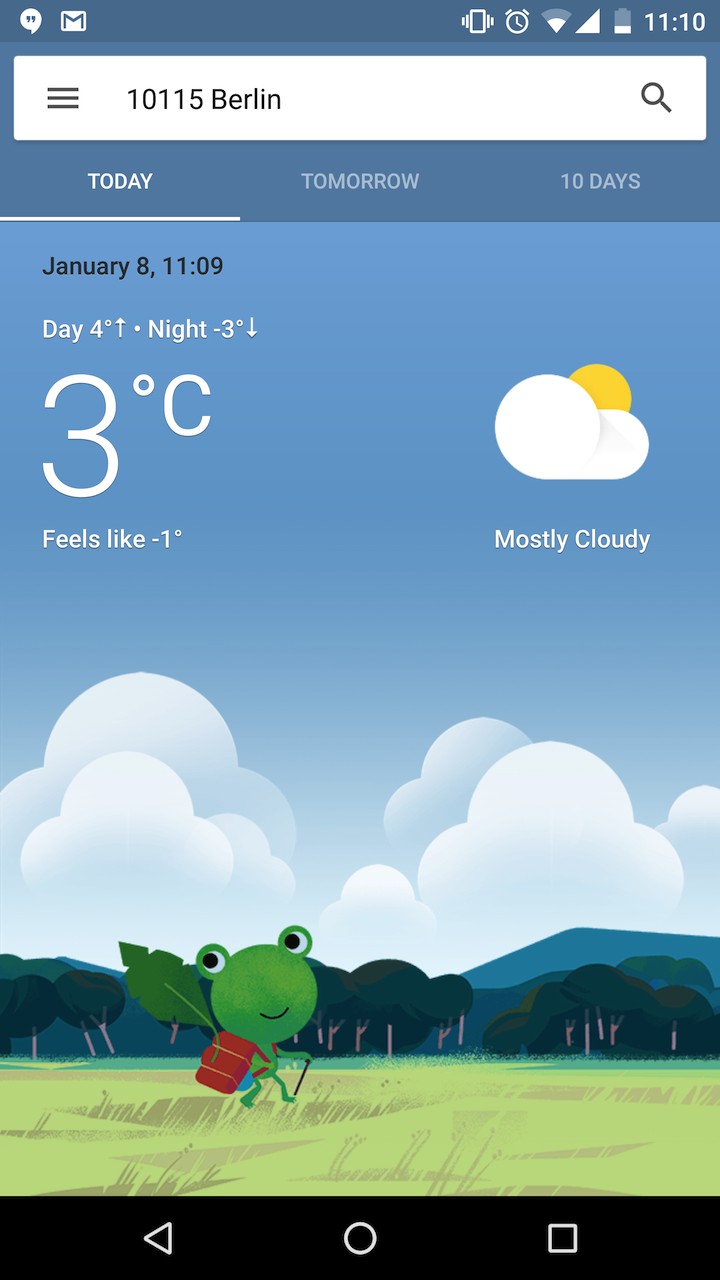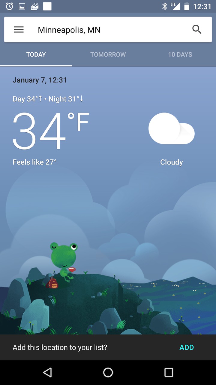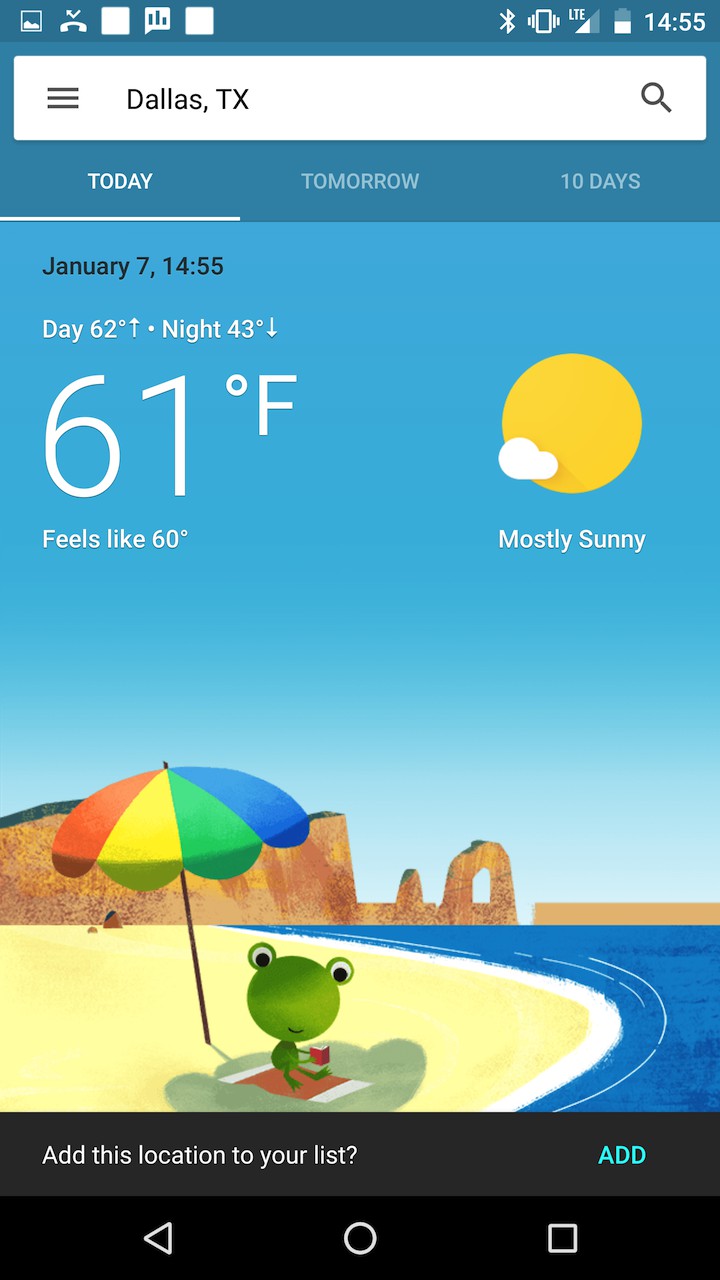 V záložke Today sa objavuje aj kreslená žaba, ktorá podľa aktuálnych podmienok mení to, čo práve robí či už je to slnenie alebo túra. Okrem toho nová kartička dokáže ukazovať oveľa viac než len teplotu. Google do predpovede pridáva kvalitu ovzdušia, čas východu a západu slnka a ďalšie zaujímavosti.
