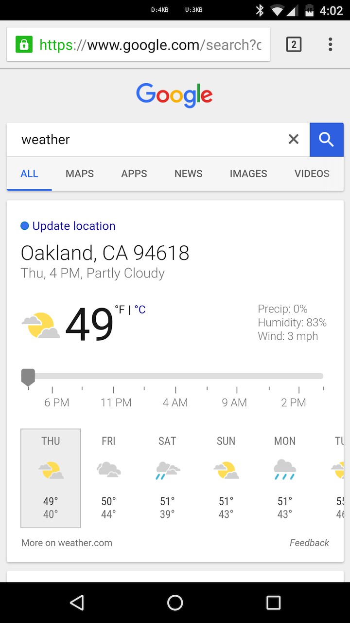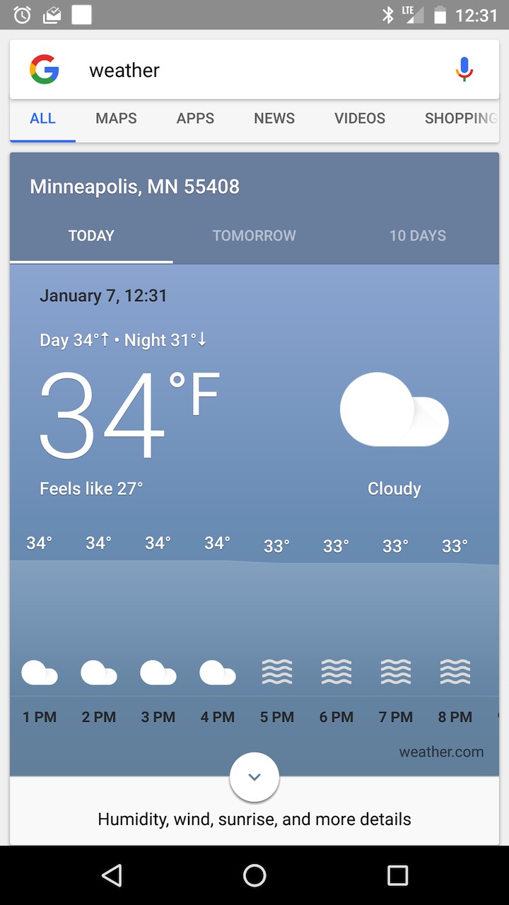 Počasie Google, ktoré sa zobrazuje v Google Now, poprípade vo vyhľadávaní je bez akýchkoľvek pochybností veľmi funkčné. Používa biele pozadie so sivým textom, dni na ktoré môžete kliknúť, časovú os, ktorú môžete posúvať a niekoľko minimalistických ikoniek v sivej, žltej a modrej farbe.
