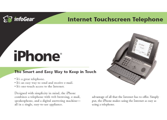 Prvý iPhone tohto sveta predstavila ešte v roku 1998 tiež kalifornská spoločnosť InfoGear. Ich nové zariadenie predávali ako „Internetový telefón s dotykovou obrazovkou.“ Očividne však nešlo o smartfóny, teda minimálne taký smartfón, aký poznáme dnes. InfoGear iPhone bol stolový telefón, ktorý ponúkal čiernobielu rezistívnu dotykovú obrazovku s rozlíšením 640 x 480. Nechýbala mu ani vysúvajúca QWERTY klávesnica, prístup na web a email a 2 MB RAM. Telefón sa predával za 500 dolárov, prístup na internet ste si však museli prirodzene dokúpiť za cenu od 9,95 dolárov na mesiac (alebo 19,95 dolárov, ak ste chceli neobmedzený prístup).