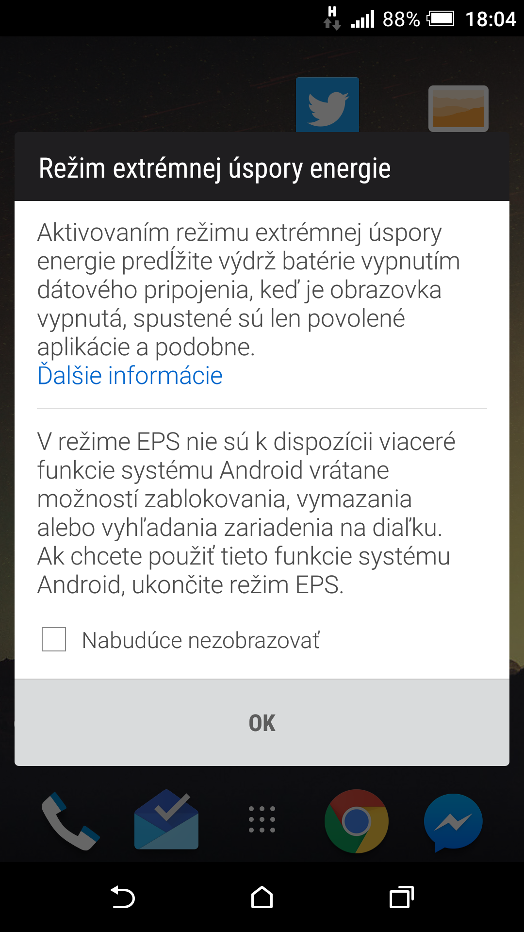 Na šetrenie batérie ponúka Sense dva režimy – jeden si mnohí z vás ani nevšimnú (obmedzí jas, mierne výkon a zakáže niektorým aplikáciam automatickú synchronizáciu dát) a ten druhý zase radikálne zmení nielen používateľské prostredie, ale aj značne obmedzí funkcionalitu. Prístupné totiž potom bude už len volanie, SMSkovanie, e-mailová schránka alebo kalkulačka. Ideálne to môže byť i v prípade snahy zvýšiť pracovnú produktivitu – po aktivácii nie sú dostupné niektoré podstatné rušivé elementy, ako napríklad sociálne siete, YouTube či akýkoľvek messenger.