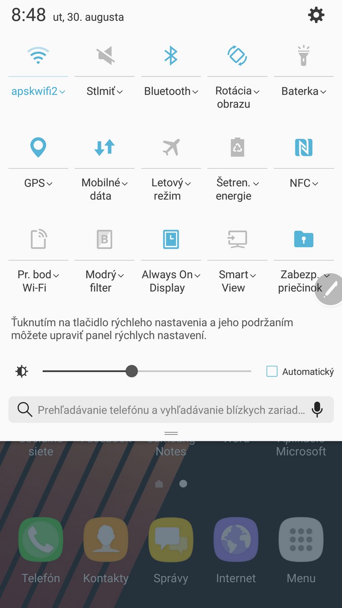 Note 7 so sebou zároveň prináša celý rad zmien v TouchWize. V žiadnom prípade nejde o veľké zmeny, skôr o maličké poupratovanie či doplnenie. Samsung napríklad pozmenil notifikačné menu. Nastavenia jasu displeja sa posunulo nižšie čo znamená, že teraz musíte smerom dolu swipnúť dvakrát. Zaujímavé je aj pridanie políčka pre vyhľadávanie priamo do rýchlych nastavení. Toto vyhľadávanie sa nespojí s Google, namiesto toho prehľadá napríklad súbory alebo čokoľvek čo hľadáte priamo v telefóne.