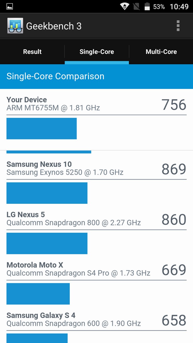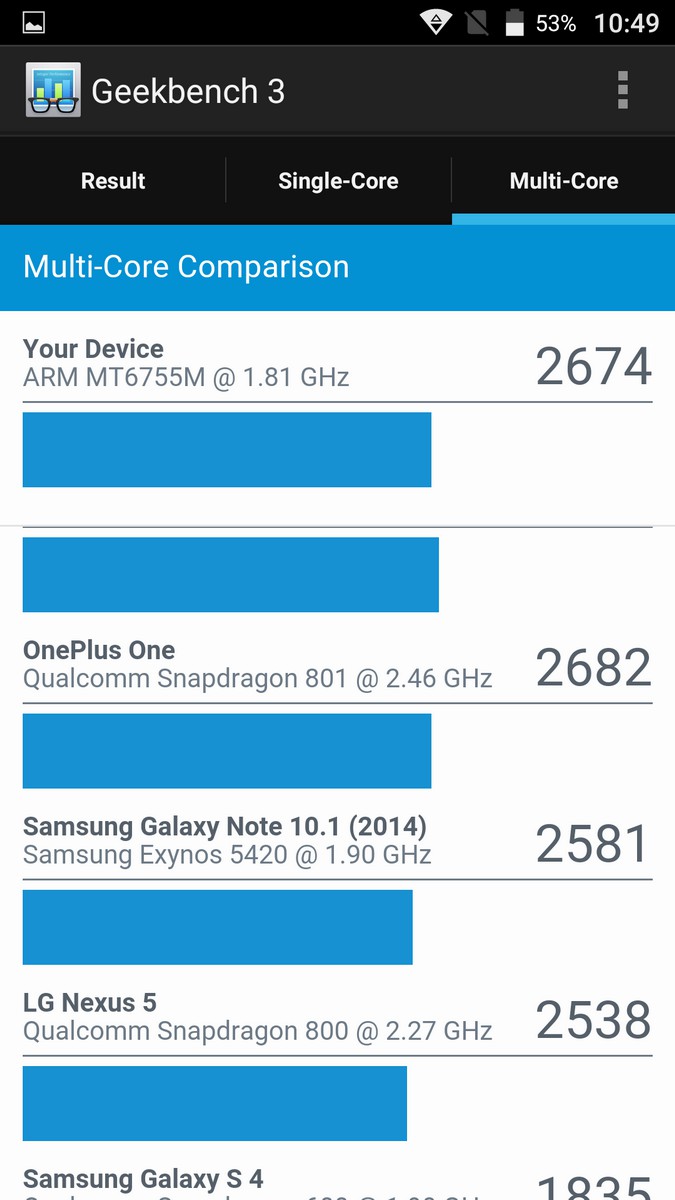 V najznámejšej benchmarkovacej aplikácii, AnTuTu, získal UMi Max skóre 45 308, zatiaľ čo Meizu m3 Note len 43 230. V prospech UMi je to teda 1 697 bodov.