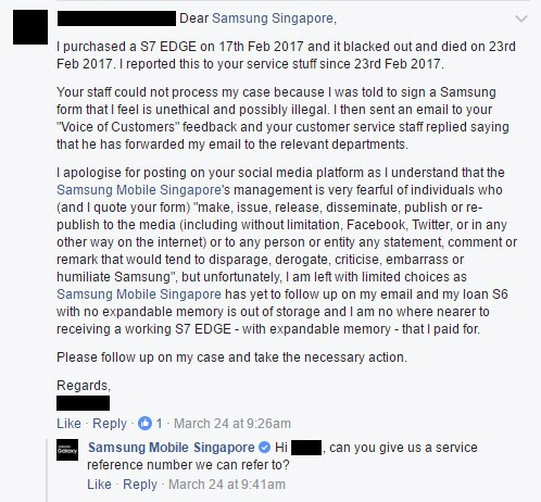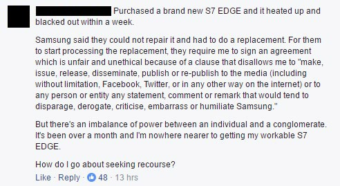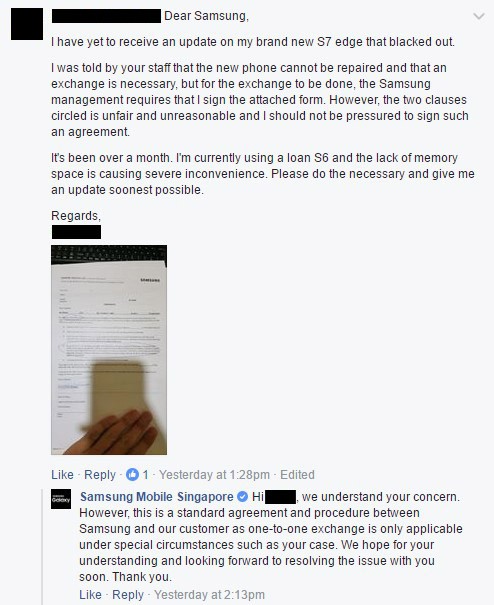Po tom, ako muž zmluvu podpísať odmietol mu zamestnanci obchodu náhradný smartfón nevydali. Rozhodol sa teda, že napíše email Samsungu, ktorý mu odpísal, že sa jeho dotazu budú venovať, no odpoveď už nikdy neprišla. Mesiac po incidente, teda 24. marca sa rozhodol, že svoju sťažnosť zverejní na facebookovej stránke Samsung Singapur, kde mu odpísali, že ide o štandardnú praktiku.