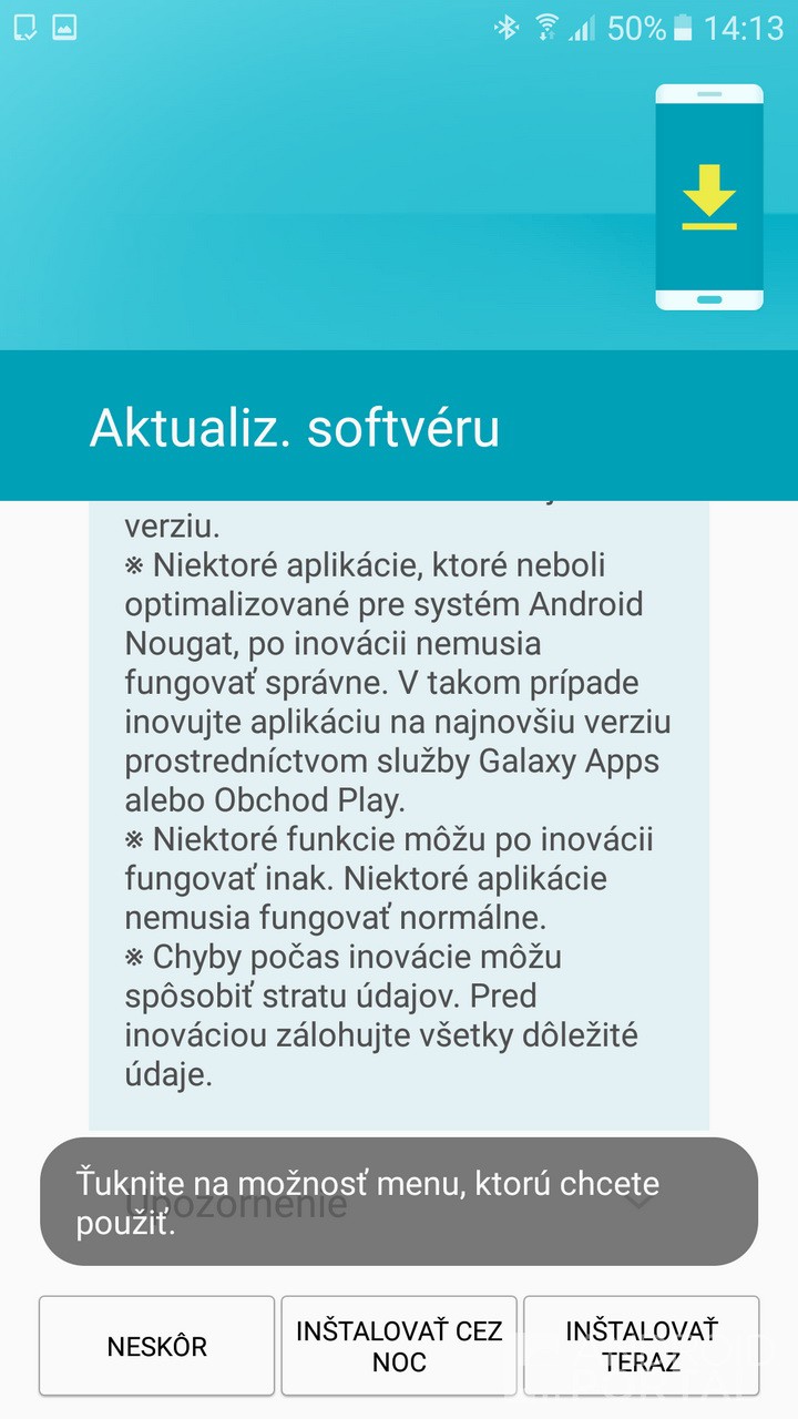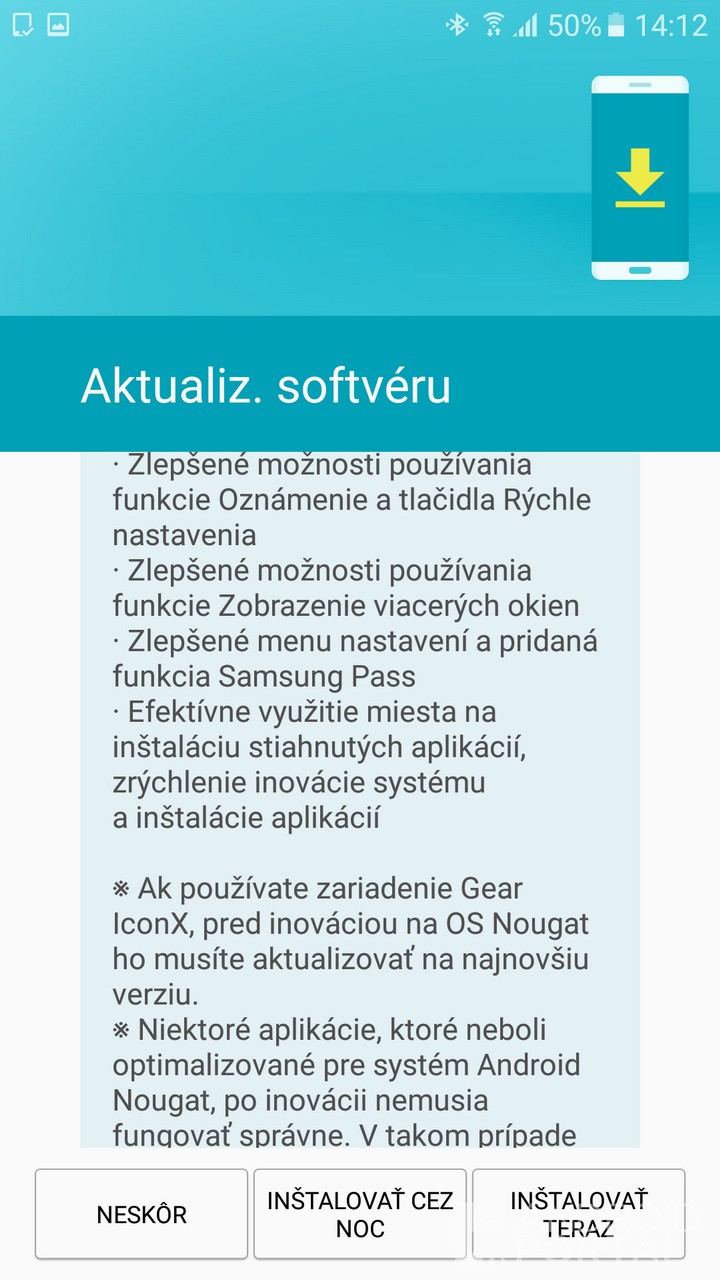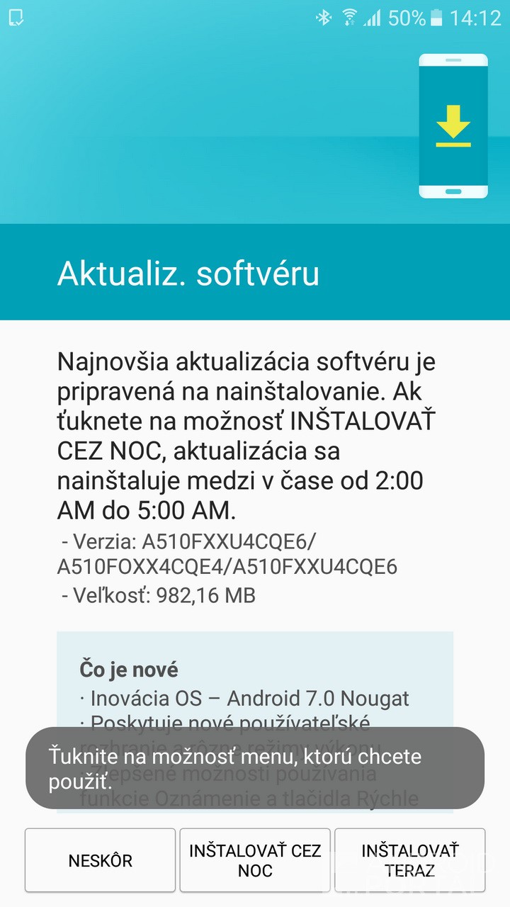 O prijatí vyše 900 MB aktualizačného balíčka nás informoval náš čitateľ, ktorý nám zároveň poslal aj screenshoty z aktualizačného procesu, ako aj z finálneho produktu, teda smartfónu bežiaceho na Android 7.0 Nougat.
