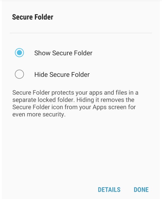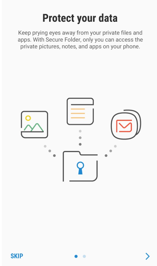 Aplikácia Secure Folder oddeľuje aplikácie nainštalované v základnom úložisku a v oddelenom úložisku tak, aby sa zvýšil stupeň ochrany tých najcitlivejších dát.