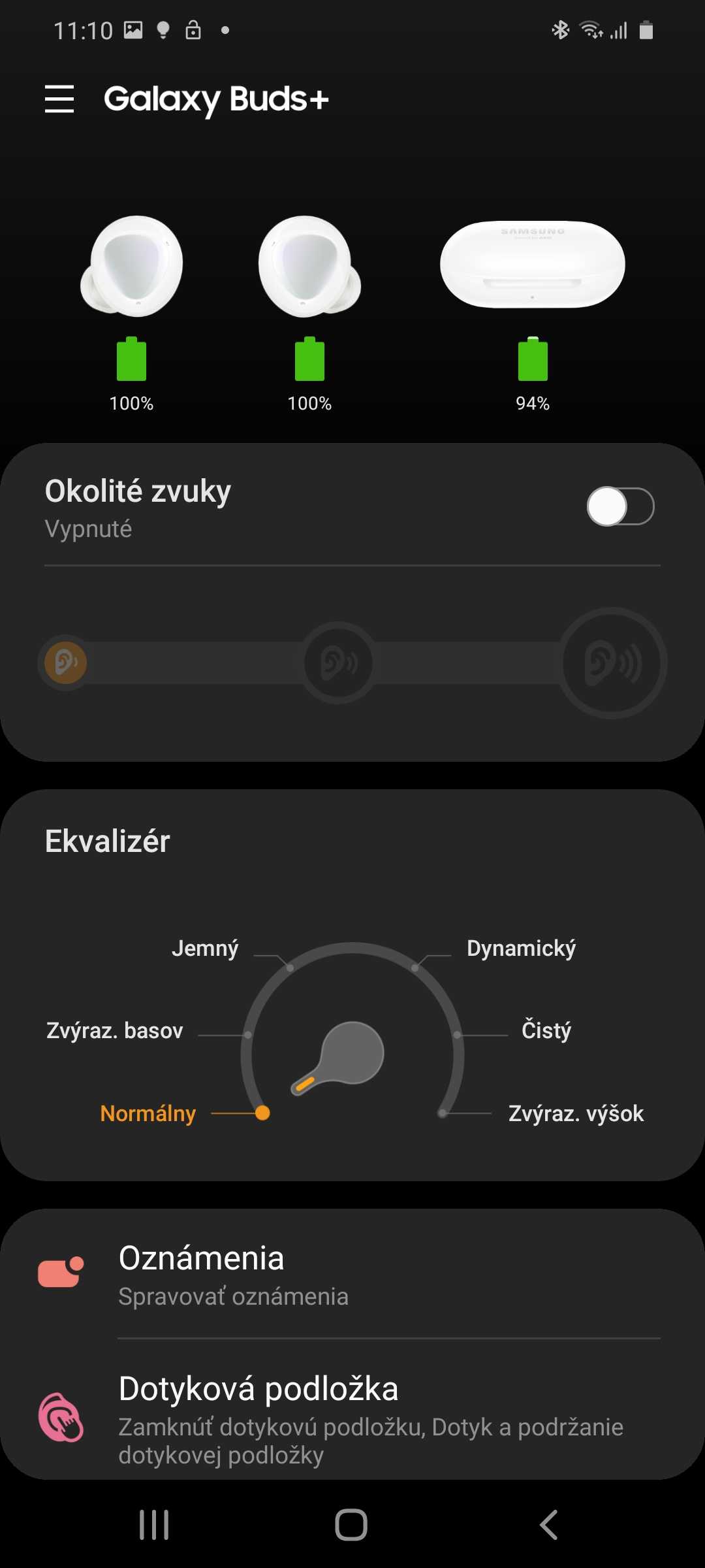 Podobne ako pri Galaxy Buds, aj pri Galaxy Buds+ máte na výber funkciu Okolité zvuky, ktorá do slúchadiel prepúšťa, ako názov napovedá, okolité zvuky. K dispozícii sú tri úrovne hlasitosti prepúšťaného zvuku. Vďaka tomu budete mať aj na rušnej ulici presný prehľad o svojom okolí.